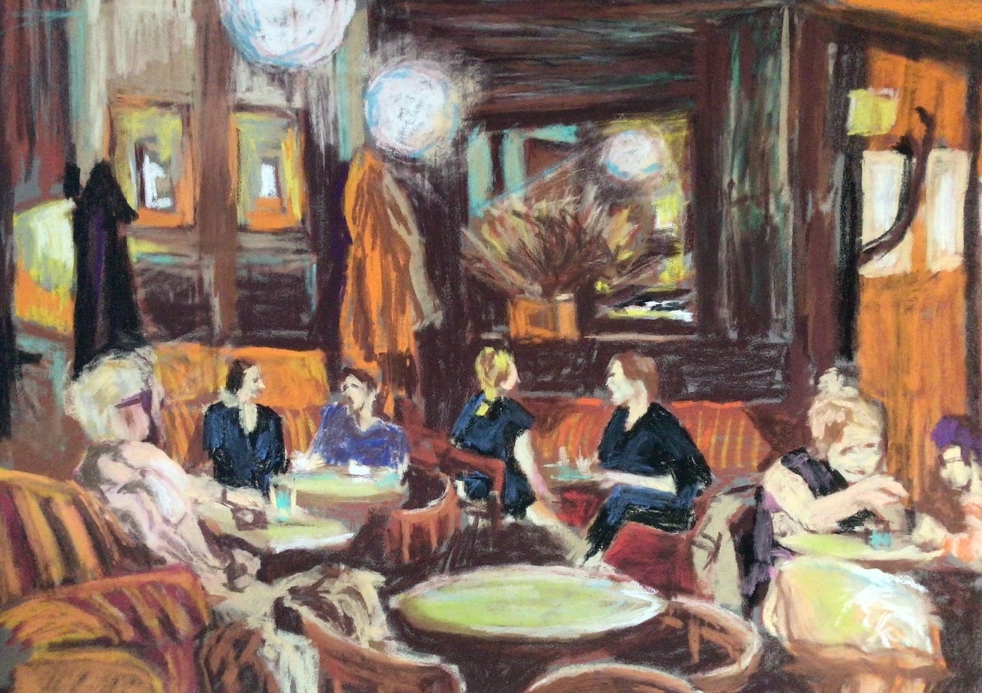 Das kommt davon,wenn man schon zum Frühstück Austria3 mit Wolfgang Ambros, Georg Danzer und Reinhard Fendrich hört. "Jö, schau! So a Sau, wos macht a nakata im hawelka?!" Er ist nicht nur der eleganteste Flitzer von Wien ... Mal einen Cartoon ausprobiert. 30 x 40 cm, Softpastell auf Pastellmat.