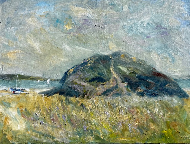Eine kleine Impression aus der Bretagne. In der Nähe von Dournanez, Finistere. Hier nochmals die berühmte Mini-Insel, Ilsalgren. Bei bestem Wetter. Die Insel hat die Ausmaße von ca. 1000 qm und eine Höhe von ca. 30 Metern. Öl, 30 x 40 cm, Malplatte.