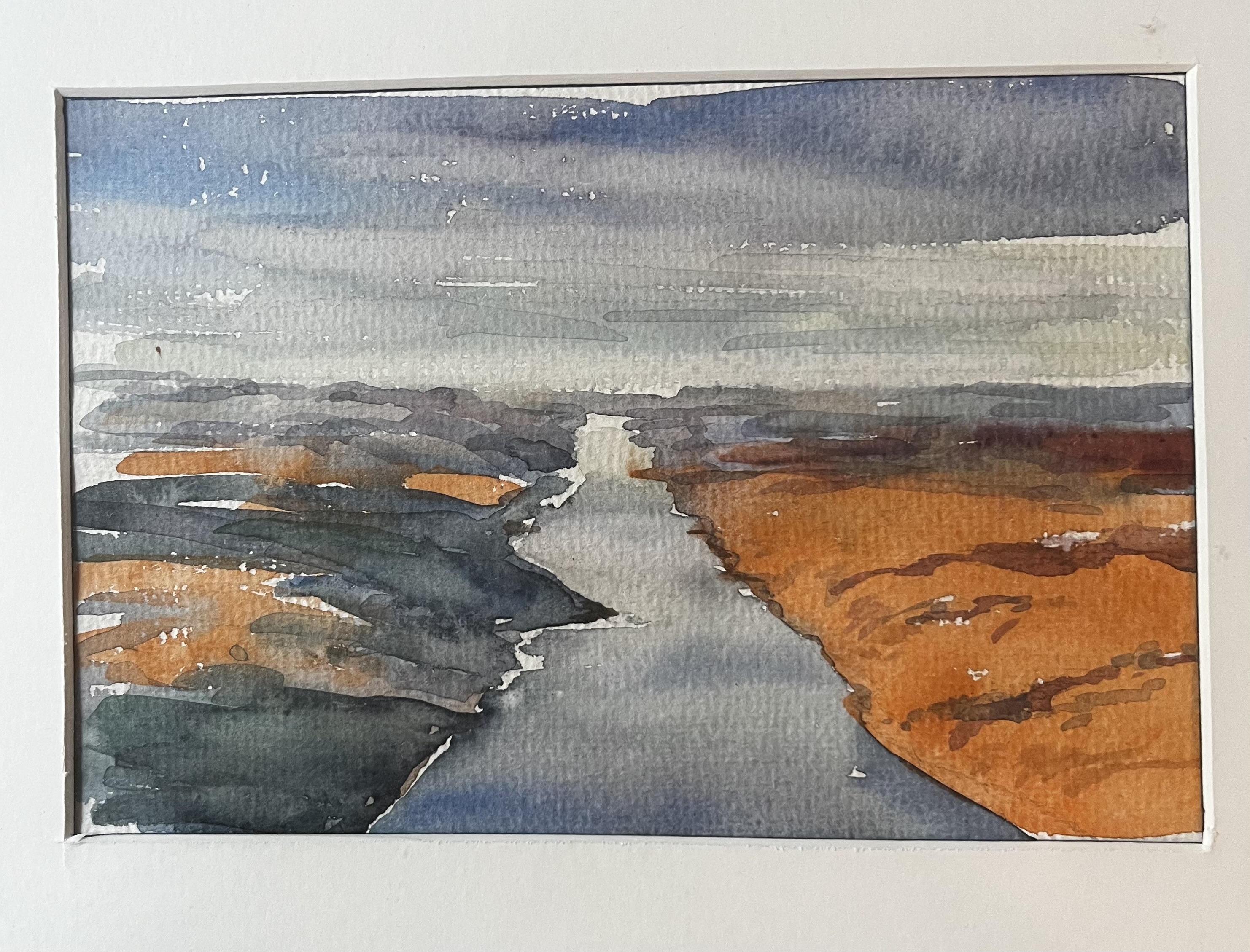 Eine kleine Impression aus der Bretagne. In der Nähe von Dournanez, Finistere. Das Land von der Ebbe ausbetrachtet. Nach dem Sturm! Rechts die Insel Ilsalgren mit ihren stattlichen ca. 1000 qm. Aquarell, 300 Gramm, Arches.30 x 40 cm.