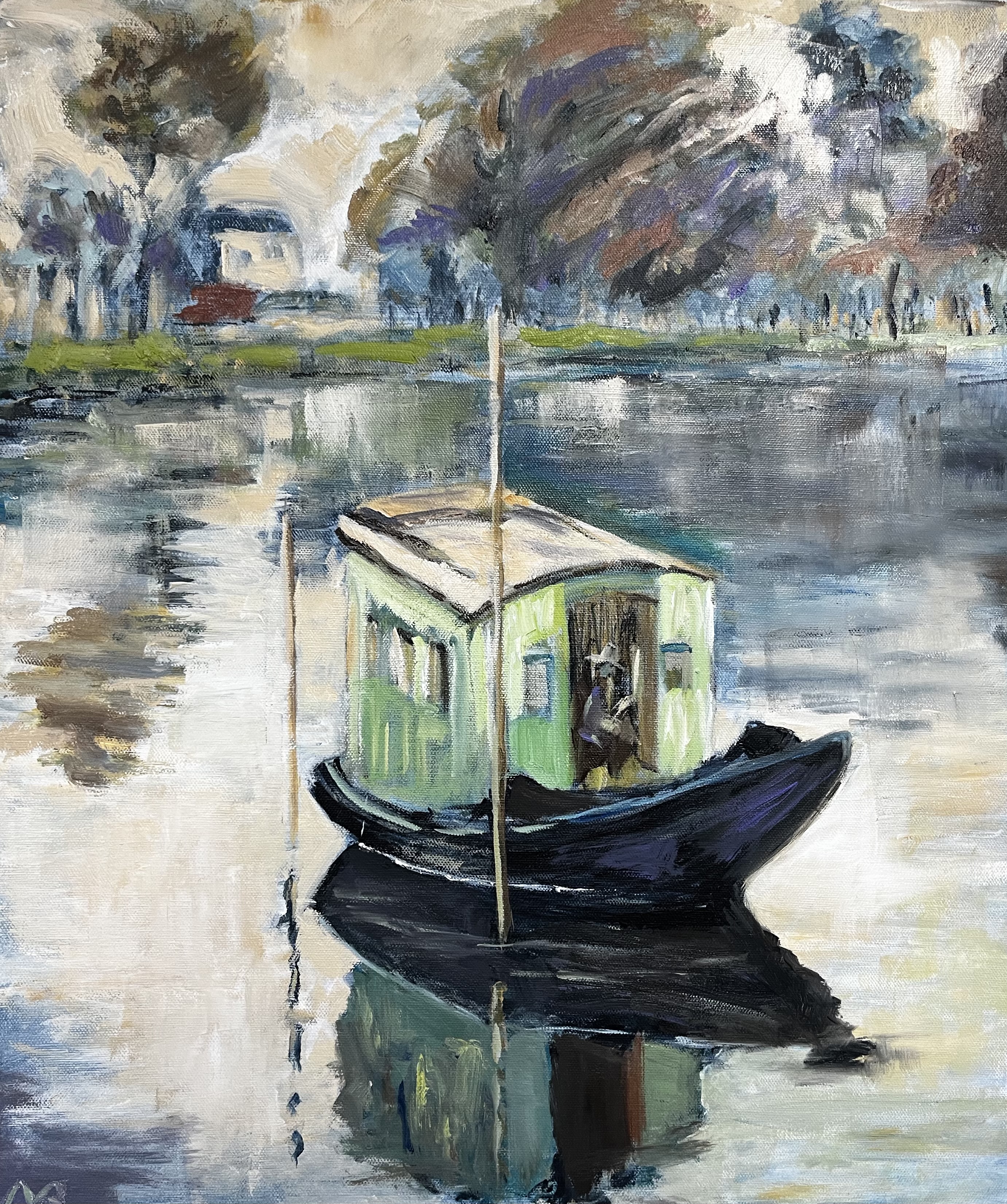 Hier habe ich ein Bild von Monet, das ich schon vor Jahren kopiert habe, etwas freundlicher gestaltet. Alles wurde etwas heller übermalt. Beim Wasser habe ich auch den Shaper verwendet. Das ist ein Plastikpinsel, der die Farbe gut verstreichen lässt. Keilrahmen, Öl, 60 x 50 cm.