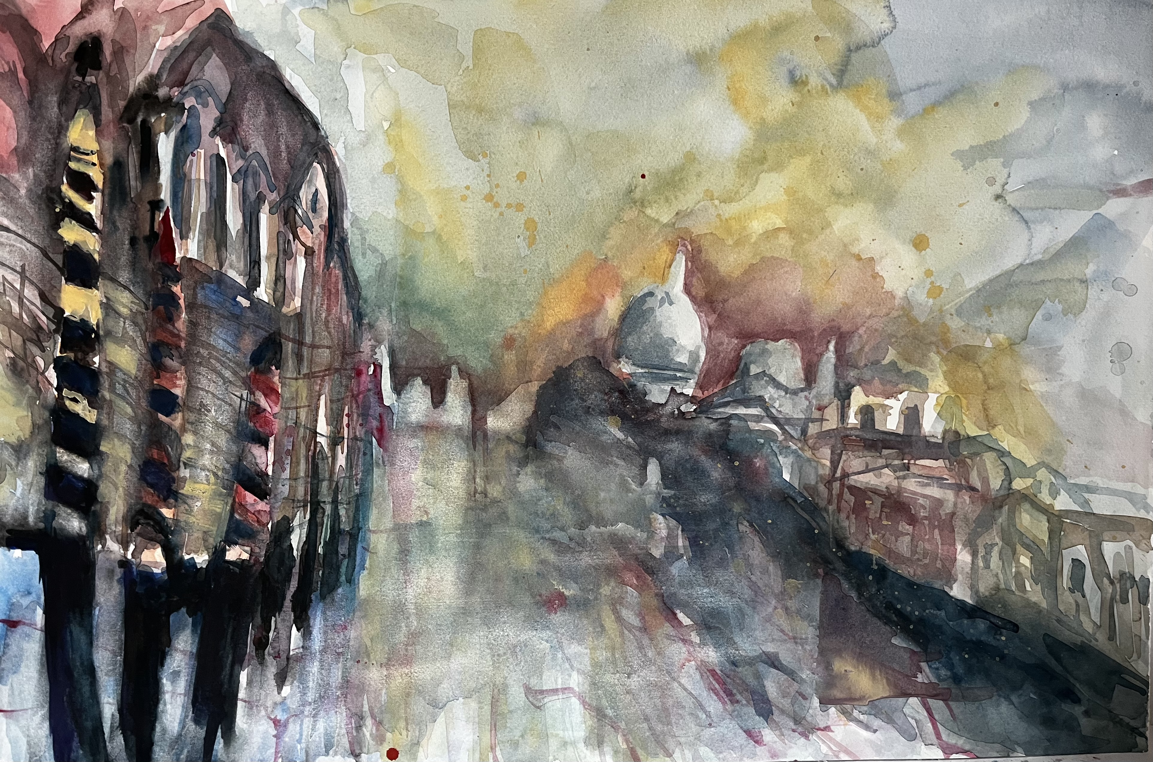 Ab 6.2.25 findet 8 x am Donnerstag um 14:15 - 16:15 ein Aquarelltermin in der VHS Gröbenzell statt. Der Kurs ist schon gut besucht. Bei Interesse bitte direkt die VHS Gröbenzell kontaktieren.Beim Aquarell ist eigentlich die Devise, "Alles muss fließen". Das ist nicht so einfach. Die einzelnen Gegenstände sollen nicht sehr akkurat gemalt werden und die jeweiligen Farben sollten mit den Farben daneben etwas verfließen. Aber natürlich auch nur, wenn es passt. Es kann auch zu klaren Abgrenzungen kommen, wenn es der Sache entspricht. In diesem Fall sind zum Besipiel die Anlegepfosten für die Gondeln im unteren Teil sehr klar vom Wasser abgegrenzt. Könnte man aber auch anders machen, so dass die Pfosten am Rand etwas mit dem Wasser verlaufen. Das ist Geschmackssache, bzw. ein so genannter Formkontrast zum mehr oder weniger verfließen der anderen Gegenstände zueinander. Was nie verfließen soll ist die Negativmalerei. Hier wird eine Sache über den Hintergrund definiert. In diesem Fall ist es die Gebäudesilhuette im Hintergrund bzw. die Kirche. Die Negativalerei ist ein sehr wichtiges Element in der Aquarellmalerei. Es vermittelt Atmosphäre, da es meistens bei Gegenständen gemacht wird, die nicht so detailliert gemalt werden sollen. Überhaupt ist das detaillierte Malen ein Schwachpunkt in der Aquarellmalerei, den viele Maler jedoch gerne machen. Genauigkeit ist beim Aquarell nicht gefragt. Es soll die Sache in ihrer Grundsätzlichkeit dargestellt werden, also mehr symbolisch. Dies unterstützt die Vorstellung des schnellen Aquarells. An einem Aquarell arbeitet man nicht mehrere Tage, in der Regel. Es kann jedoch tatsächlich der Fall sein, dass man erst nach Jahren eine Korrektur macht, da es einem erst jetzt aufgefallen ist, was nicht so optimal war. Das sind aber die Ausnahmen. Trotzdem sollte man dann korrigieren, falls möglich. Hier sind wir aber auch schon beim nächsten Punkt, die Korrektur beim Aquarell. Grundsätzlich kann man alles korrigieren. Die Einschränkung liegt darin, dass man, wenn Farbe vom Papier genommen werden soll, nicht mehr das ursprüngliche Weiß des Papiers bekommt. Ausnahme bildet das Wegkratzen der Farbe mit einem Messer. Dabei wird aber die Oberfläche des Papiers verletzt. Das muss aber nicht unbedingt negativ sein. Wenn es keine große Fläche ist, dann ist das in Ordnung. Zum Beispiel wenn man Reflektionen an Bäumen andeutet oder im Wasser. Das so genannte Auswaschen von Farbstellen auf dem Papier ist eine Methode, bei der man viel Farbe wegnehmen kann. Nach dem vollkommenenen Trocknen der Stelle (5 Minuten zum Beispiel) kann wieder mit anderer Farbe lasiert werden. Dies macht man oft bei Wasseroberflächen oder Hauswänden. In diesem Bild habe ich das beim Wasser-Teil und beim Himmel gemacht. Hier kann man dann, nach dem Auswaschen, viel hellere neue Farbe verwenden. Das nur ein paar Hinweise zum Aquarellmalen.